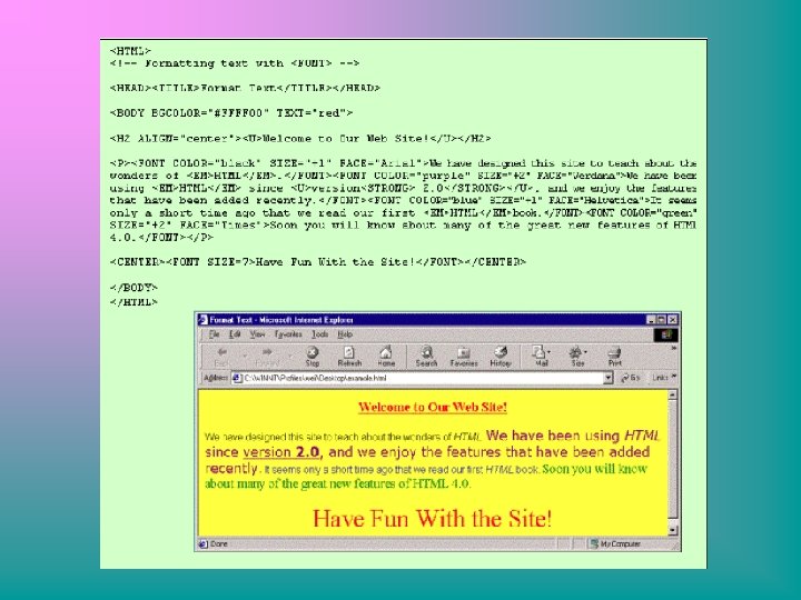 FORMATIRANJE TEKSTA NAREDBOM <FONT> • <FONT> naredba omogućuje nam da preciziramo boju, veličinu i font koji ćemo koristiti za tekst na našoj stranici. • Sintaksa <FONT SIZE=size COLOR= color FACE= font> Formatted Text</Font> • Veličina fonta koju podržavaju preglednici kreće se od 1 -7. • COLOR svojstvo omogućuje nam da mijenjamo boju formatiranog teksta