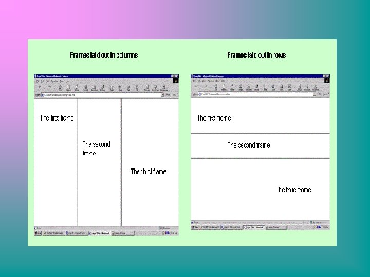 UPOTREBLJAVANJE OKVIRA U WEB STRANICAMA • Okviri omogućavaju podjelu prozora u različite regularne čelije, koje su načinjene u različitim HTML dokumentima • Položaj okvira je definiran upotrebom <FRAMESET> taga • Tag <FRAMESET> ima dva osnovna atributa: ROWS i COLS