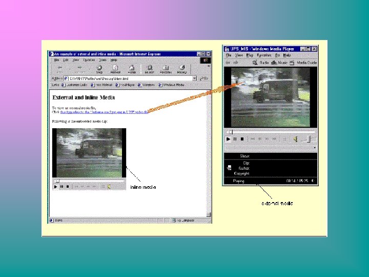 RAD SA MULTIMEDIJIMA • multimedija može biti dodana na Web stranicu na dva načina: kao vanjski medij ili unutarnji medij • Sa vanjskim medijem, zvuk ili video je povezan pomoću hiperlinka • Unutarnji medij je smješten na Web stranicu kao ugrađen objekt