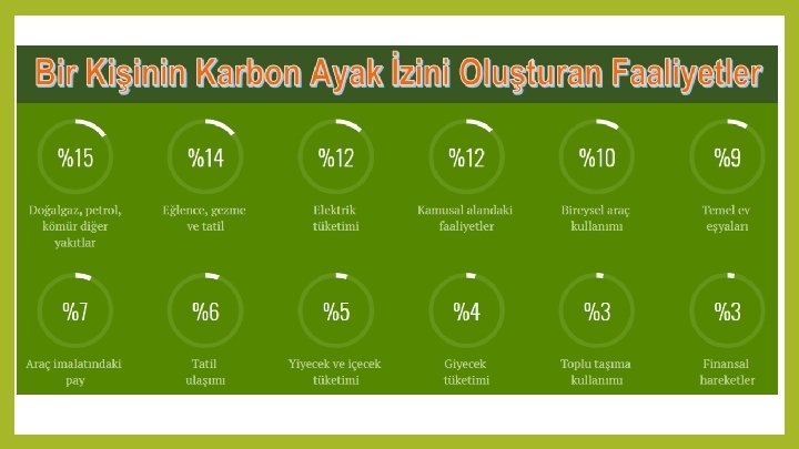 KARBON AYAK İZİ Birincil Ayak İzi Doğrudan kullanımlarımız sonucunda ortaya çıkan karbon salınımımızdır. ● Evde enerji tüketimi ve ulaşım tüketimimiz. İkincil Ayak İzi Dolaylı kullanımlarımız ile çevreye saldığımız karbon salınımımızdır. ● Satın aldığımız herhangi bir ürün için atmosfere bırakılan karbon miktarı.