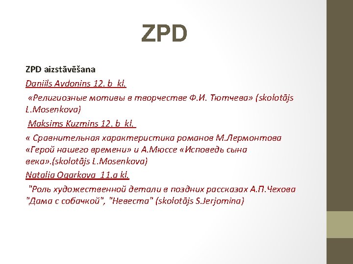 Skolas daiļlasītāju konkurss 5. – 12. kl (latviešu un krievu valodas katedras) Uzvarētāji • Kirils Lavrenovs 5. d • Alina Karpeviča 5. b • Marija Kuzmina 6. c • Milana Zaiceva 9. d