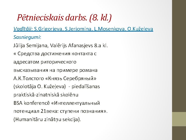 Pētnieciskais darbs. (8. kl. ) Sasniegumi: Daniela Tkačenko, Valērija Timare, Vsevolods Koļeda 8. b kl. «Владимир Высоцкий и Латвия» (к юбилею Владимира Высоцкого – поэта, барда, актёра) (skolotāja S. Grigorjeva) - piedalīšanas radošā apvienībā darbā «Планета Высоцкого» .