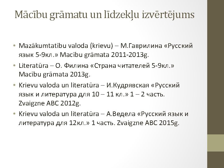 Secinājumi: • Mācību piekšmetu standartu pārzināšanā un prasību izvirzīšanā – organizēt un veidot procesu atbilstoši valsts noteiktajiem standartiem un mācību programmai krievu valoda uliteratūrā. • Izmantot jaunas mācīšanās metodes un darba formas. • Efektīvi un optimāli izmantot konsultāciju laiku. . Piedalīties projektos, novadīt zinātniski-pētniecisko darbu, paaugstināt profesionalitāti. • Sadarboties ar citu priekšmetu skolotājiem, novadīt integrētas mācību stundas. • Sadarboties ar latviešu valodas skolotājiem , organizēt kopējos pasākumus. • Mācību priekšmetu tematisko plānu pilnveide. • Sadarboties ar klases audzinātājiem, ar bibliotekāriem. • Pilnveidot ārpusklases darba metodes un formas ( «atklātais mikrofons» , literārā viesistaba, lasīšanas dienas ). • Mācību procesā izmantot internetu un sociālos tīklus. • Mācīšanas procesā saistībā ar reālo dzīvi - saistīt mācību procesu ar reālo dzīvi, paplašinot skolēnu redzesloku.