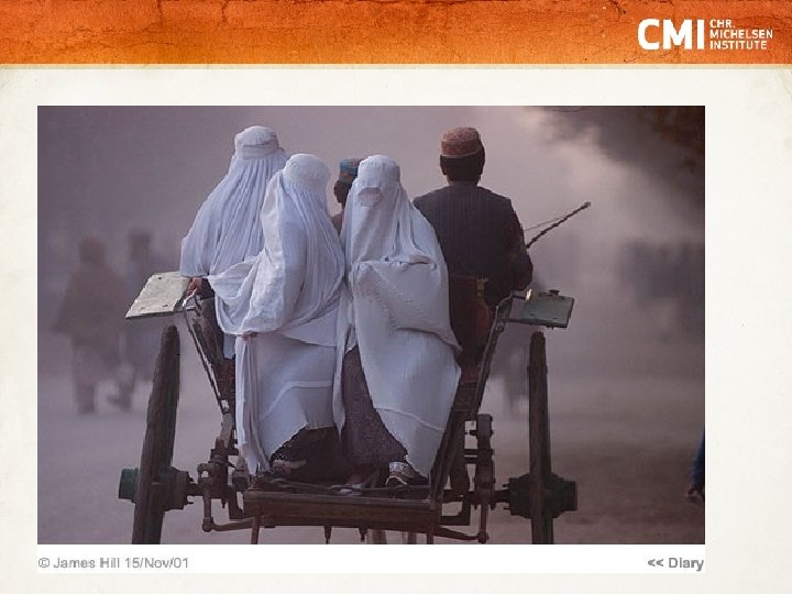 Kvinner sin situasjon • 80 % av afghanske kvinner utsatt for vold i heimen • 60 % av ekteskapa er organisert/tvungne • 50 % av kvinnene gift før 16 år = barne/mødre dødlegheit (Womankind Worldwide, februar 2008) Ekstremt høg andel sjølvmord/forsøk - brutte håp Men, sidan 2001 • 25 % i parlament, jenter i skule, kvinner i offentlege posisjonar, men lite makt & undertrykkjande shia familielov • Satsing på bygging av skular, helsestasjonar og jordmor tenester hjelpe kvinner