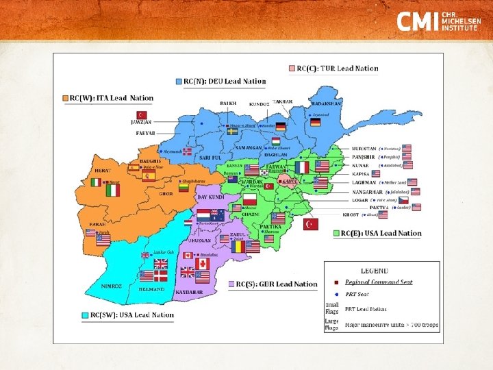 Norsk støtte 3 prioriterte utviklingssektorar • Statsbygging • Utdanning • Landsbygd utvikling (og helse) Faryab satsingsprovins : PRT, politi og bistand Ca 500 soldatar, • Trening av afghansk hær + politi, juristar, fengselspersonell