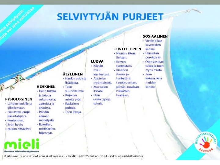 Kriisit ja selviytyminen • Lapset ja perheet kohtaavat huolia, murheita ja suuriakin elämää mullistavia • • • kriisejä. Lasten huolet ja murheet heijastuvat myös päivähoidon arkeen. Aikuisen vastuulla on rohkaista lasta puhumaan huolistaan ja opettaa lasta pyytämään apua. Useat lasten murheista helpottuvat, kun aikuinen kuuntelee, keskustelee, rohkaisee esim. yhdessä tekemisen lomassa. Aikuiset näyttävät omalla mallillaan lapsille, miten huolista puhutaan ja miten niitä jaetaan -> lapset oppivat mistä on sallittua puhua ja kenelle. Aikuiselle lapsen murheet voivat tuntua pieniltä, mutta lapsille ne ovat merkityksellisiä ja mieltä kuormittavia asioita. Myös vanhempien kohtaaminen ja keskustelut huolista keventävät lapsen mieltä. • Millaisia huolenaiheita lapset kertovat sinulle? • Miten kohtaat kriisinkokeneita lapsia ja perheitä työssäsi? • Miten saat tukea jaksamisellesi omassa työyhteisössäsi?