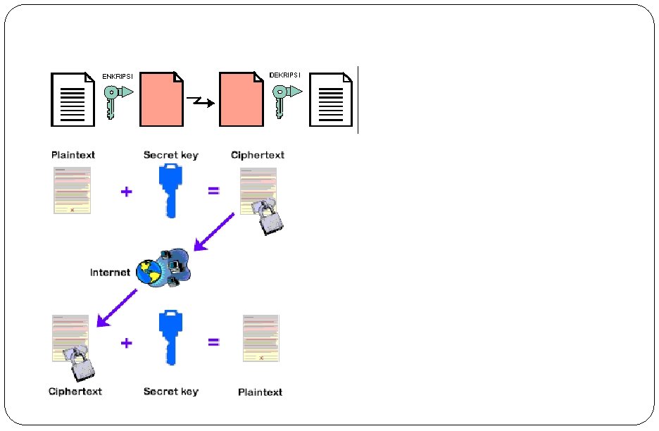 Algoritma Simetris Algoritma simetris (symmetric algorithm) adalah suatu algoritma dimana kunci enkripsi yang digunakan sama dengan kunci dekripsi sehingga algoritma ini disebut juga sebagai single-key algorithm. Sebelum melakukan pengiriman pesan, pengirim dan penerima harus memilih suatu kunci tertentu yang sama untuk dipakai bersama, dan kunci ini haruslah rahasia bagi pihak yang tidak berkepentingan sehingga algoritma ini disebut juga algoritma kunci rahasia (secret-key algorithm). Metode : DES (Data Encryption Standard)