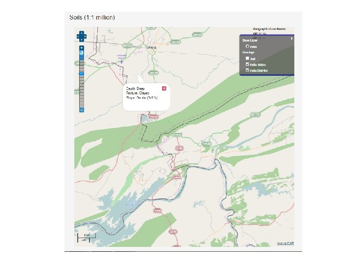 Geo-Portal Ver 2. 0 • Live on: http: //14. 139. 56. 74: 8080/geoexplorer/ • An updated interface – Two panels: Map Window panel, Layer panel – Geoportal Toolbar and Map Window Toolbar – Display of Layer Properties, Metadata and Layer Styles – Selection of map scale • Selection of base layers: Open. Street. Maps, Bing, Google • Overlay of Map Layers: Order and Transparency • Enhanced Query: Map extent and Map attributes • Add WMS (Web Map Service) Layers from remote Geoservers