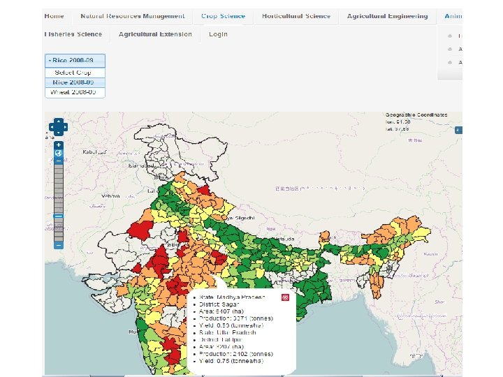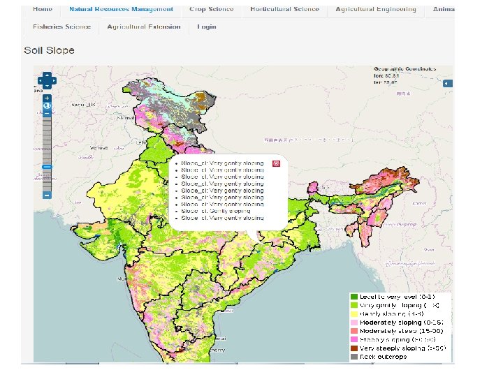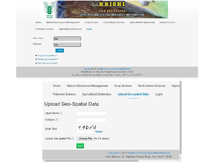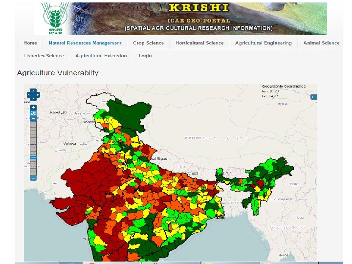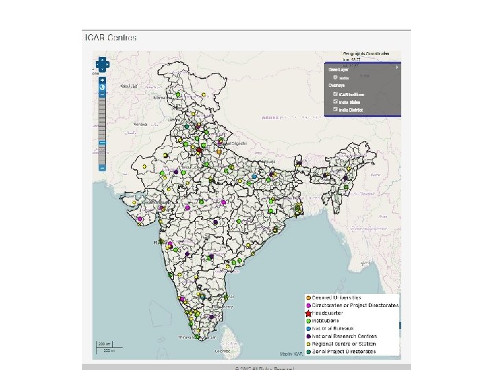 Status ØVersion 1 (beta) is online Ø http: //krishi. icar. gov. in/geoportal Ø Some of the spatial layers finalized and made online Ø Configured on ICAR Data Centre at IASRI ØVersion 2 with enhanced capabilities under development Øhttp: //14. 139. 56. 74: 8080/geoexplorer/ Ø Available on development server at IARI