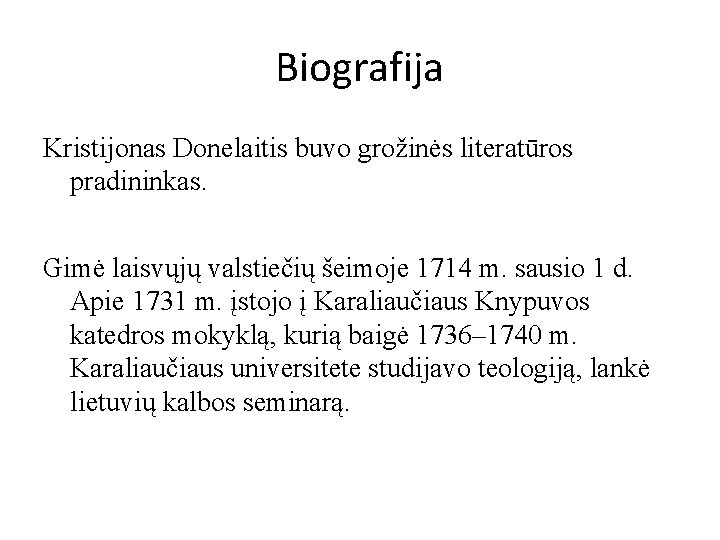Biografija Kristijonas Donelaitis buvo grožinės literatūros pradininkas. Gimė laisvųjų valstiečių šeimoje 1714 m. sausio 1 d. Apie 1731 m. įstojo į Karaliaučiaus Knypuvos katedros mokyklą, kurią baigė 1736– 1740 m. Karaliaučiaus universitete studijavo teologiją, lankė lietuvių kalbos seminarą.