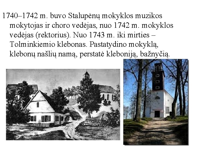Kūryba Laisvalaikiu rašė eiles lietuvių ir vokiečių kalba, komponavo muziką, dirbo barometrus, muzikos instrumentus, optinius prietaisus. Pirmieji du poeto gyvenimo Tolminkiemyje dešimtmečiai buvo nepalankūs jo kūrybiniam darbui. Atsidėti kūrybai trukdė įtempti santykiai su vietos valdžia. Kliudė ir Septynerių metų karas (1756– 1763), kuris 1756 m. tiesiogiai palietė Tolminkiemį.