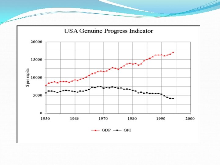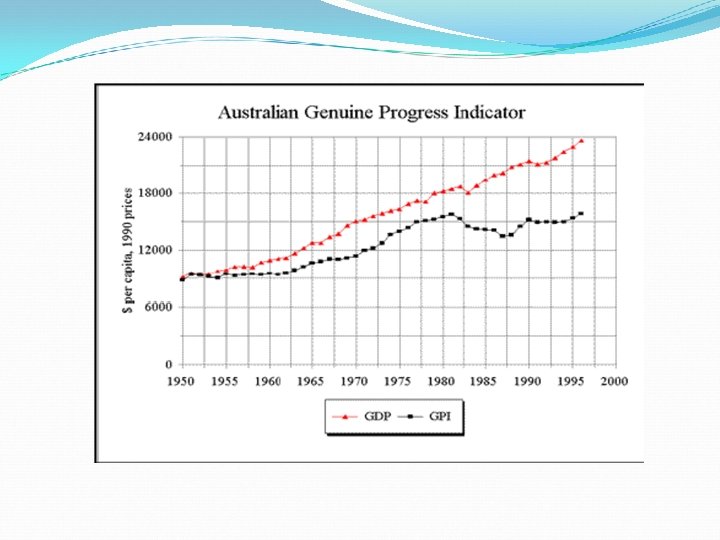 Valódi Fejlődés Mutatójának (GPI - Genuine Progress Indicator) Egységes, átfogó szerkezetben tartalmazza mind a piaci, mind a nem-piaci tevékenységek értékét, és a GDP-től eltérően hosszú távú szemléletet tükröz. Több új tételt tartalmaz: öt társadalmi és két környezeti kárral bővült a lista. A személyes fogyasztásból indul ki