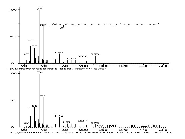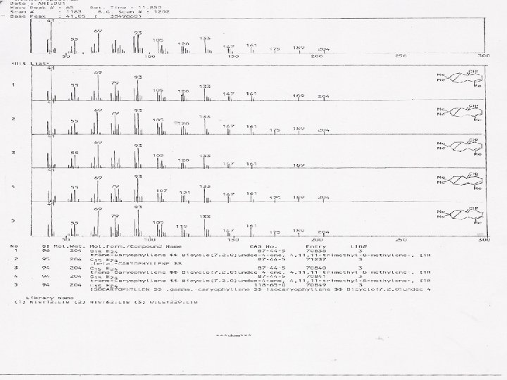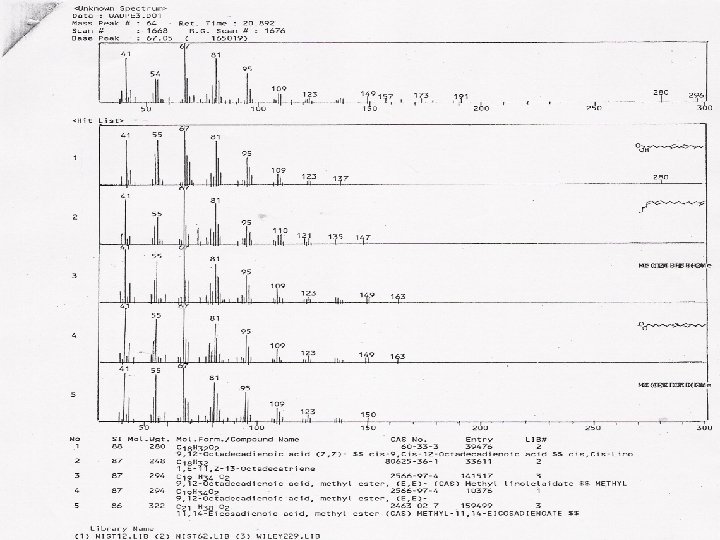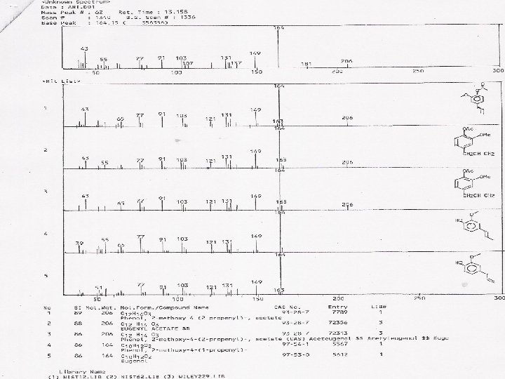 Kromatogram Gas pada Spektrometer Massa (GC-MS) Ketika detektor menunjukkan puncak, setelah melewati detektor kemudian akan diuapkan untuk diuji spektrometer massa. Hal ini akan memberikan pola fragmentasi yang dapat dibandingkan dengan data dasar senyawa yang telah diketahui sebelumnya pada komputer. Identitas senyawa dalam jumlah besar dapat dihasilkan tanpa harus mengetahui waktu retensinya