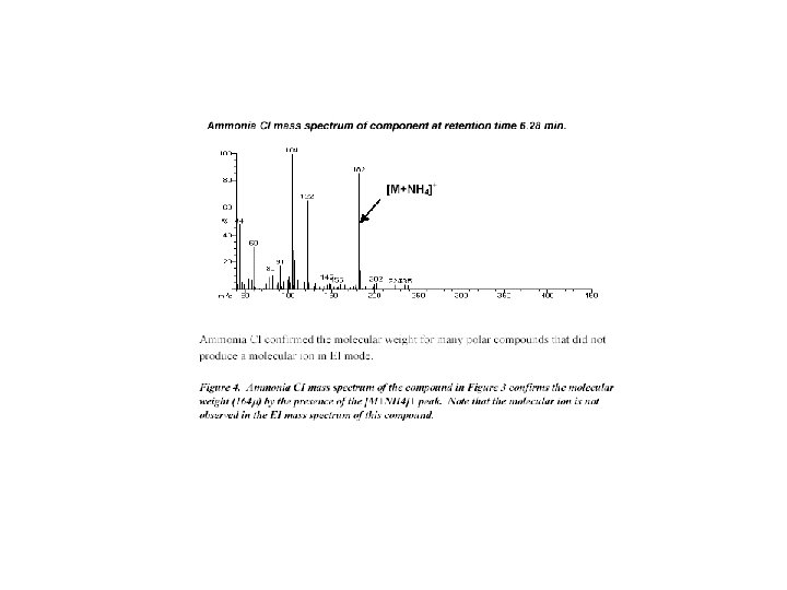CI/ ion-molecule reaction • 2 CH 4 + e- CH 5+ and C 2 H 5+ • CH 5+ + M MH+ + CH 4 • The excess energy in MH+ is the difference in proton affinities between methane and M, usually not enough to give extensive fragmentation • Kelebihan energi dalam MH + adalah perbedaan afinitas proton antara metana dan M, biasanya tidak cukup untuk memberikan fragmentasi yang luas