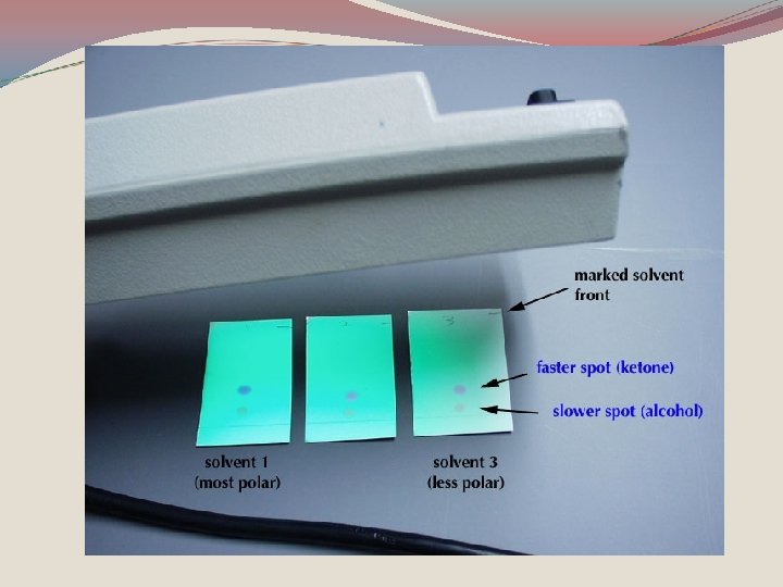 Rate of flow (Rf Value): Distance traveled by the spots Rf = --------------------Distance traveled by the solvent The Rf of any compound must be less than one.