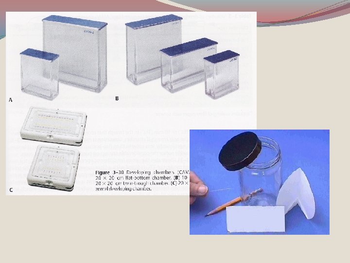 2 - Quantitative: In this case an accurate volume of samples are applied using syringes. The dimensions of plates range from 5 x 10 to 20 x 20 according to the number pf spots used. The plates are developed as usual in the chromatographic tanks. After development the concentration of material can be determined by: Ø Ø Ø Spot area measurement: Which is directly proportional to the conc. of materials. Photodensitometry: Measure transmittance, reflection or fluorescence of spots. Radioactivity: For radioactive material. These measurements are done using TLC Scanner connected to computer that perform all calculations.