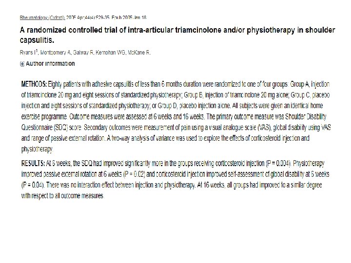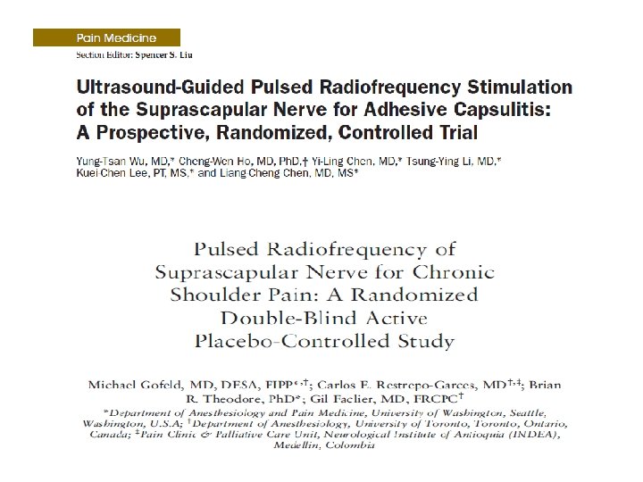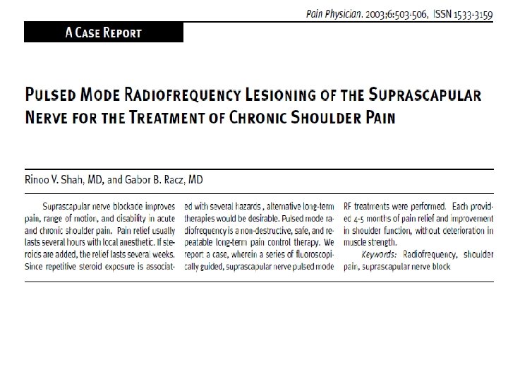 Girişimsel Ne Yapabiliriz ? • Glenohumeral eklem içine steroid en sık uygulanan yöntem • Glenohumeral eklem içi steroid + supraskapuler sinir bloğu • Pulsed Radyofrekans (PRF) yeni , non-nörodesturiktif