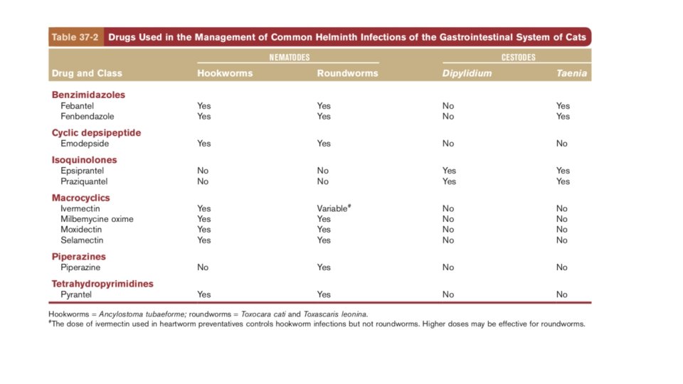 • Fenbendazol ve febantel, tartışıldığı gibi hedef helmintler için sık reçete edilir (bkz. Tablo 37 -1 ve 37 -2). Bununla birlikte, her iki bileşik de Dipydium caninum veya Echinococcus spp enfeksiyonlarının tedavisi için etkili değildir. • Febantel, diğer solucanlara ve etkili bir şekilde tedavi eden prazikuantel, kancalı kurtlara ve yuvarlak kurtlara (Drontal Plus, Bayer Animal Health) karşı etkinliğini arttırır. • Fenbendazole veya febantel, genellikle Giardia spp. • Fenbendazol, gastrointestinal hastalıklarla ilişkili olabilecek trematodlara karşı etkinliğe sahip olduğuna inanılan antelmintiklerden biridir (Alaria spp. , Nanophyetus salmincola, Heterobilharzia americana, Platynosomum fastosum).