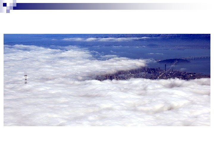 Oblaci n Podela oblaka prema spoljašnjem izgledu: ¨ ¨ n gomilasti (kumulusi) slojeviti (stratusi) perjasto-pramenasti (cirusi) slojevito-gomilasti (stratokumulusi) Podela oblaka po mestu nastanka ¨ visoki – cirusi, cirokumulusi, cirostratusi ¨ oblaci srednjeg sloja - altokumulusi, altostratusi ¨ niski – stratokumulusi, stratusi, nimbostratusi, kumulonimbusi n Podela oblaka po fizičkom sastavu (na osnovu konstitutivnih elemenata) ¨ ¨ ¨ potpuni kristali u vidu iglica potpuni kristali i skelet od suvog snega kristalni skelet i sitne kapljice magle (poluprečnik manji od 0, 05 mm) sitne kapljice (poluprečnika od 0, 05 do 0, 5 mm) kišne kapljice (poluprečnika od 0, 5 do 5 mm)