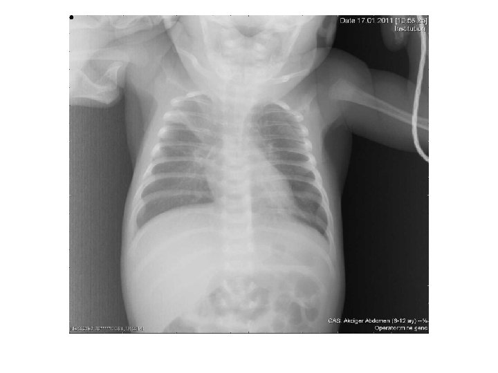 FİZİK MUAYENE • Takipne: En sık belirti, >50 -60/dk • Taşikardi • Ateş: Genellikle 38. 5 -39 o. C • Hafif konjonktivit veya farenjit • Retraksiyonlar: İnterkostal, subkostal, suprasternal • Burun kanatlarının solunuma katılması • Ekspiryumda uzama • Siyanoz • Raller • Wheezing • Otitis media • Apne: Genellikle 6 hafta • Palpable karaciğer ve dalak