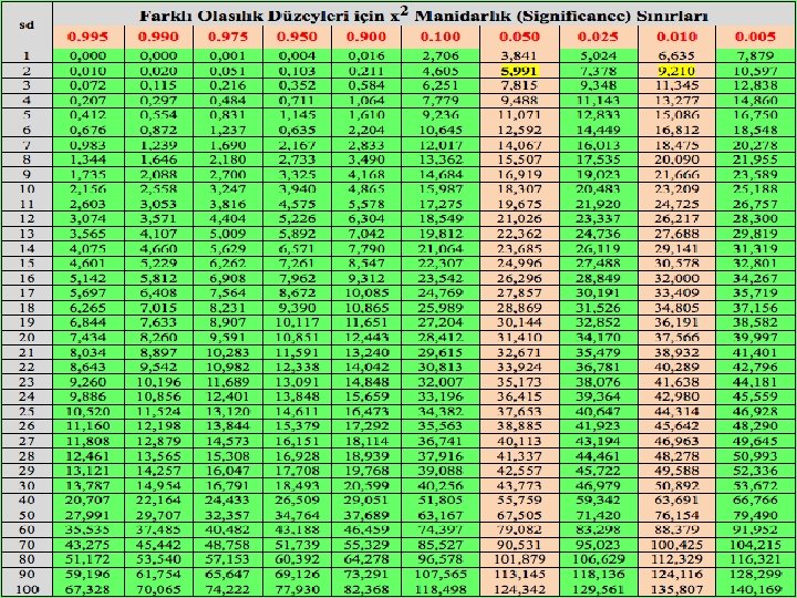 § α =. 01 alsaydık, kritik değer= 9. 210 olacaktı. § Öte yandan 6. 12>9. 210 olduğundan belirlenen farklılık. 01 düzeyinde anlamlı bulunmayacaktı. § Sonuç olarak; 0. 05 düzeyi için H 0 reddedilir; H 1 kabul edilir (p<. 05); 0. 01 düzeyi için H 1 reddedilir; H 0 kabul edilir (p>. 01); 18