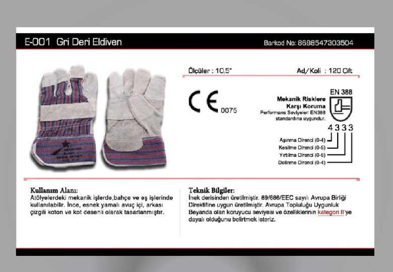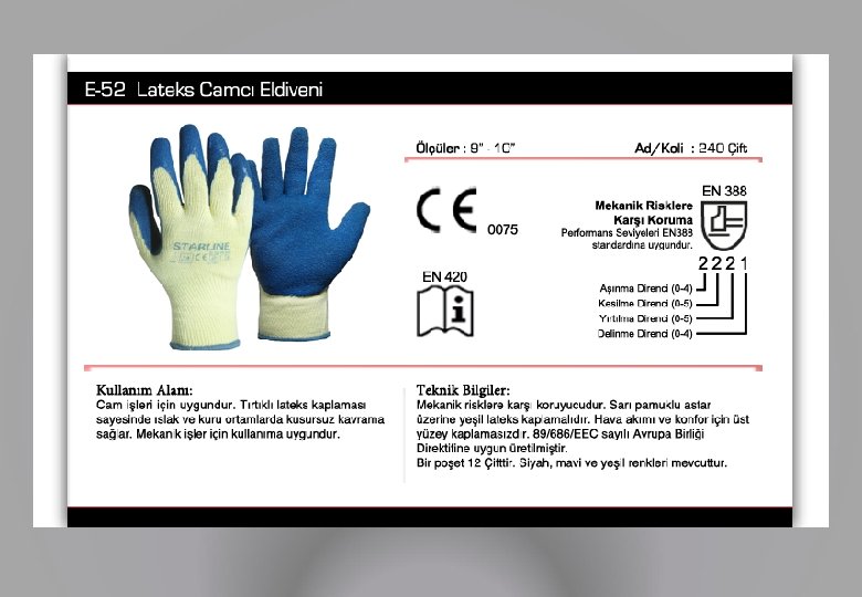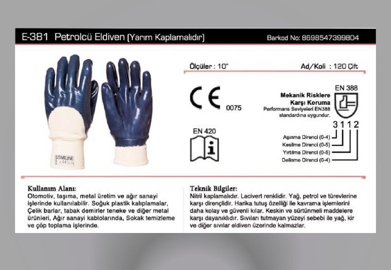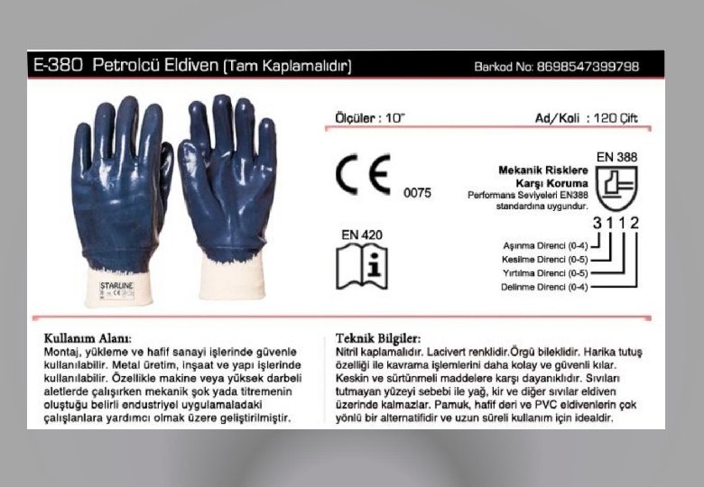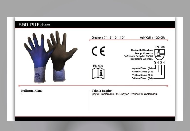 DAHA ÖNCE ELDİVEN SEÇİMİ YAPMAK ZORUNDA KALDINIZ MI? HANGİ STANDARTLARDA SORUSU… Eldivenlerde hangi standartlar önemlidir? Kullanılan eldivenler KKD (Kişisel Koruyucu Donanım) ile ilgili 89/686/EEC Direktifi ve ilgili EN standartları uyarınca sertifikalandırılmış olup CE ibaresi taşımalıdır. 16