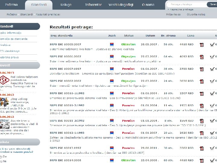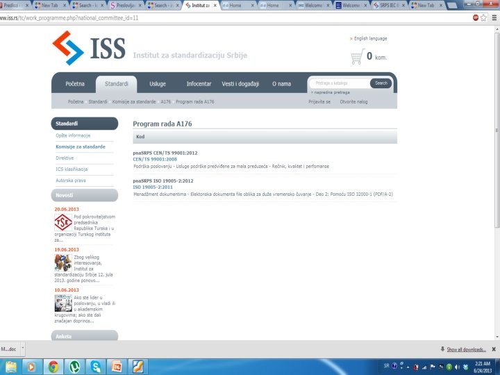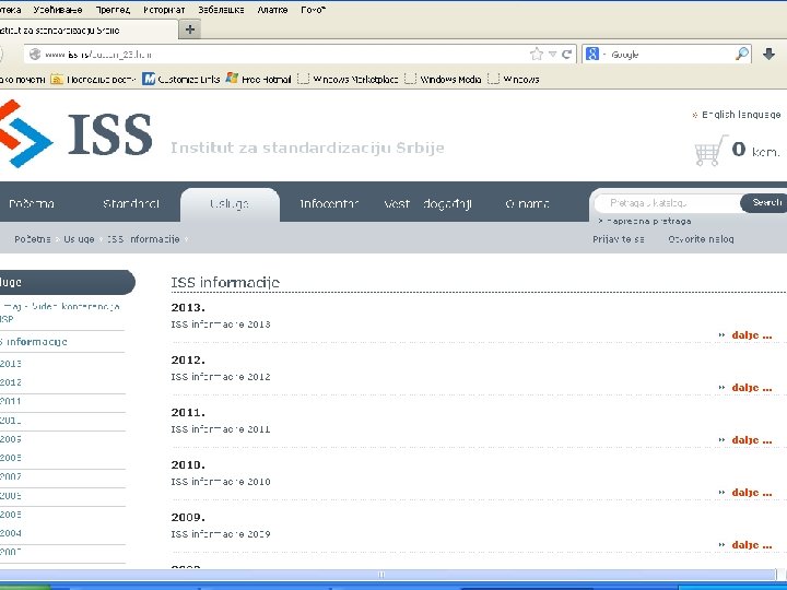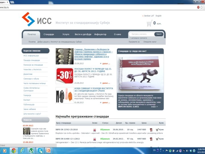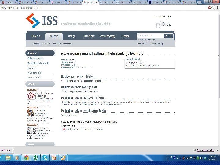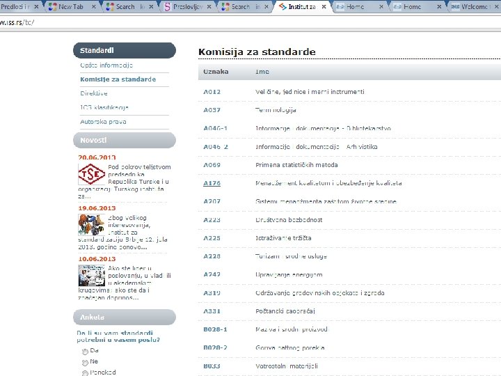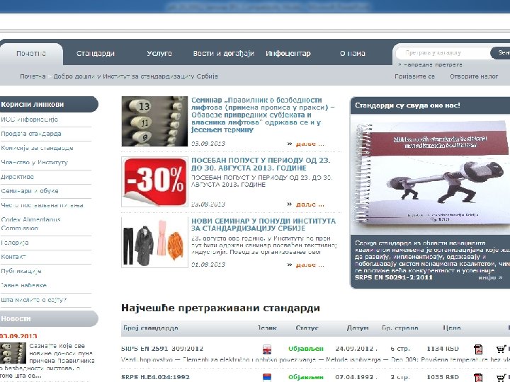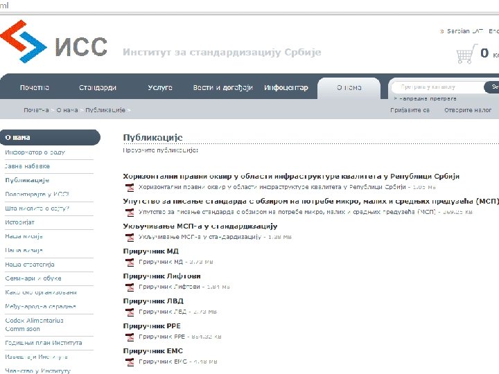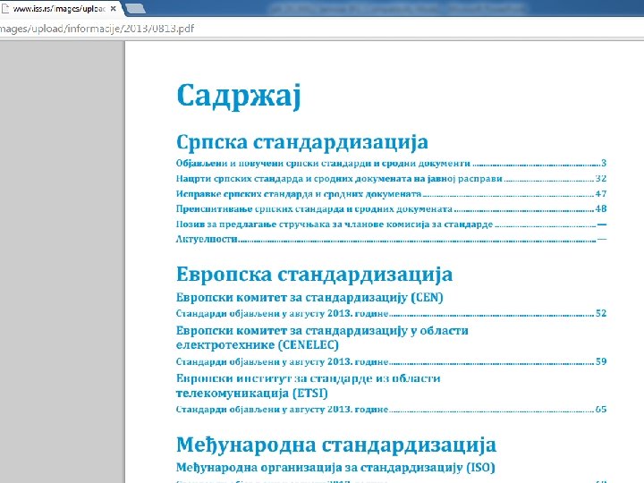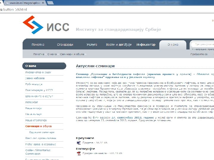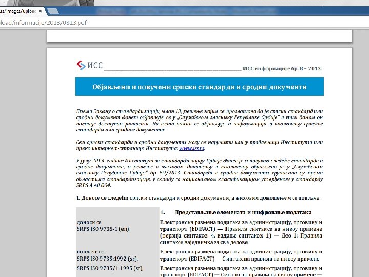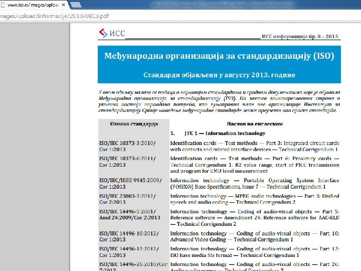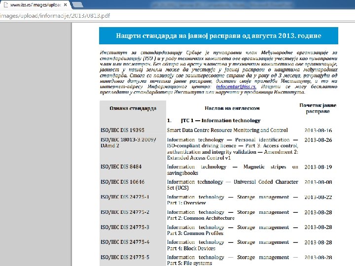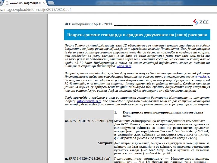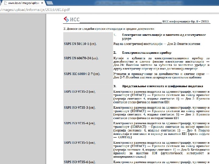 Institut za Standardizaciju Srbije - ISS • Zakon o standardizaciji („Službeni glasnik RS”, br. 36/09) • Odluka o izmenama i dopunama osnivačkog akta Instituta za standardizaciju Srbije(“Službeni glasnik RS”, br. 88/09) • Označavanje standrda - SRPS • Dobrovoljna standardizacija • Razvoj nacionalnih standarda na srpskom i engleskom jeziku