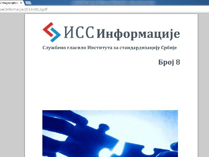 Delatnost ISS • informativni centar za standarde; • odobrava upotrebe nacionalnog znaka usaglašenosti sa SRPS standardima; • uspostavlja pravila po kojima se srpski standardi donose, preispituju i povlače; • predstavlja i deluje u interesu Republike Srbije u mađunarodnim i evropskim organizacijama za standardizaciju; • promoviše primenu standarda organizacijom edukativnih i promotivnih aktivnosti.