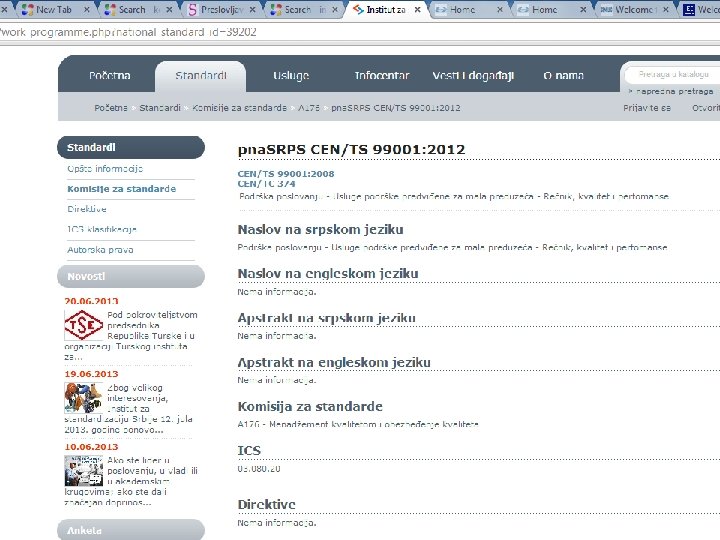 Kako se donose standardi? Komisije za izradu i donošenje standarda • Izrađuju nacionalne standarde preuzimanjem ISO, IEC ili EN na srpskom ili engleskom jeziku • Izrađuju čisto nacionalne standarde • Prate rad odgovarajućih tehničkih komiteta u ISO-u i CEN-u • Učestvuju u izradi evropskih i međunarodnih standarada • Preispituju sve standarde na 5. god.