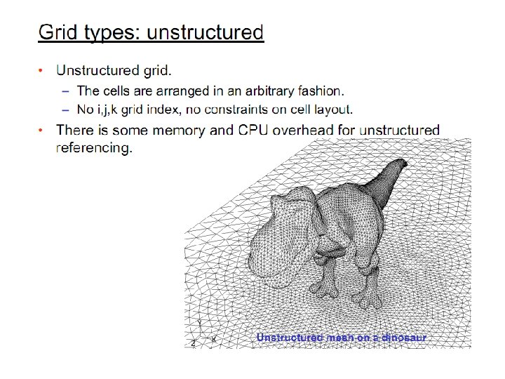 Unstructured grids Unlike structured grid, do not have definite data structure Elements are usually triangular/tetrahedral Gives a lot of flexibility in mesh generation (multi-blocking not required, can tessellate CAD geometry). Unstructured solvers are more expensive than structured solvers and getting high order of accuracy is more difficult. Equations are solved in integral form (so no derivatives are required)