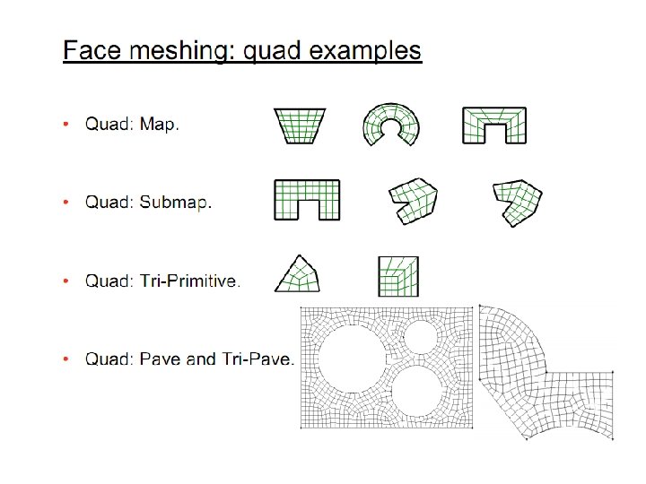 Quad/Hex Methods Structured • Requires geometry to conform to specific characteristics • Regular patterns of quads/hexes formed based on characteristics of geometry • Internal nodes always attached to same number of elements Unstructured • No specific requirements for geometry • quads/hexes placed to conform to geometry. • No connectivity requirement (although optimization of connectivity is beneficial)