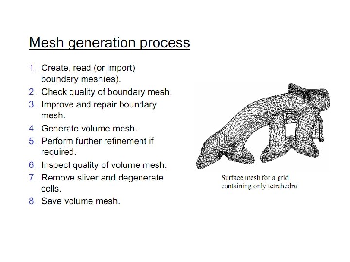 The Simulation Process Geometry Basics The Mesh Generation Process Meshing Algorithms Tri/Tet Methods Quad/Hex Methods Hybrid Methods Surface Meshing Mesh Data Representation Mesh Post Processing Smoothing Topology Improvement Adaptive Mesh Size Control