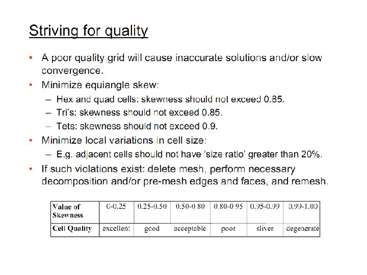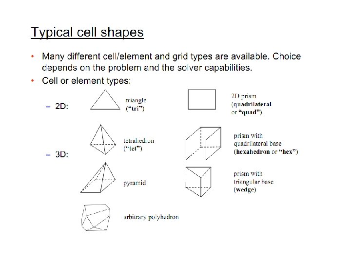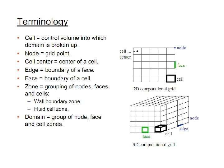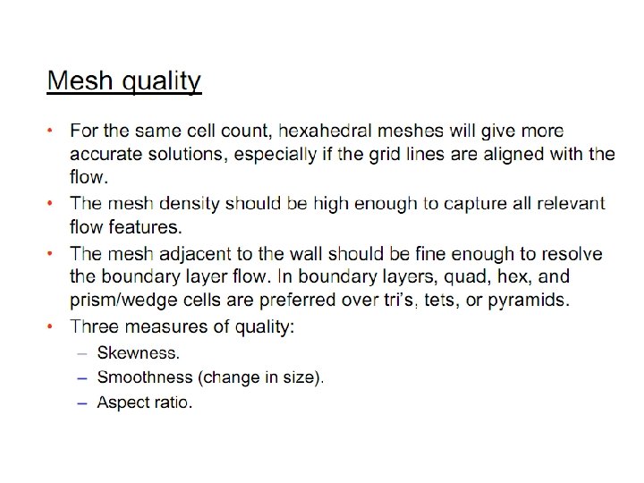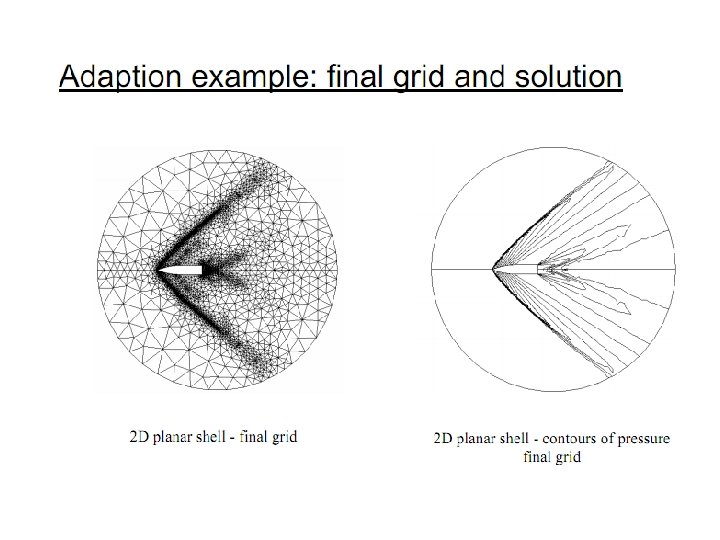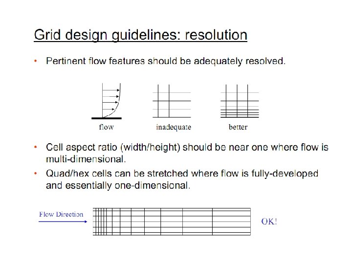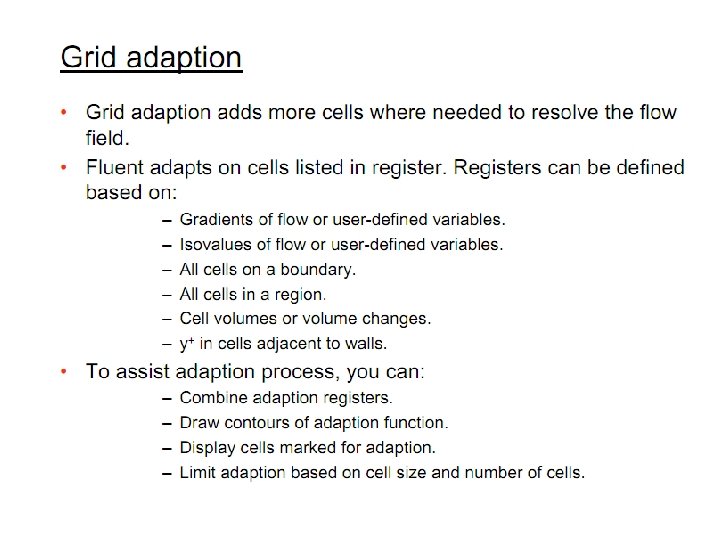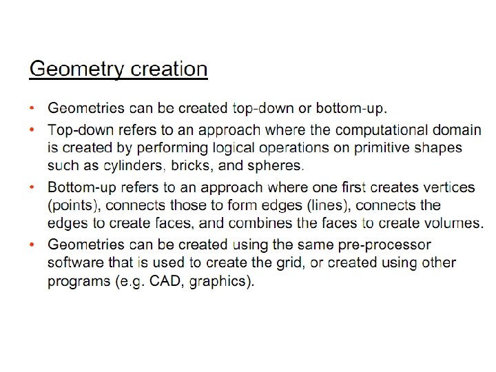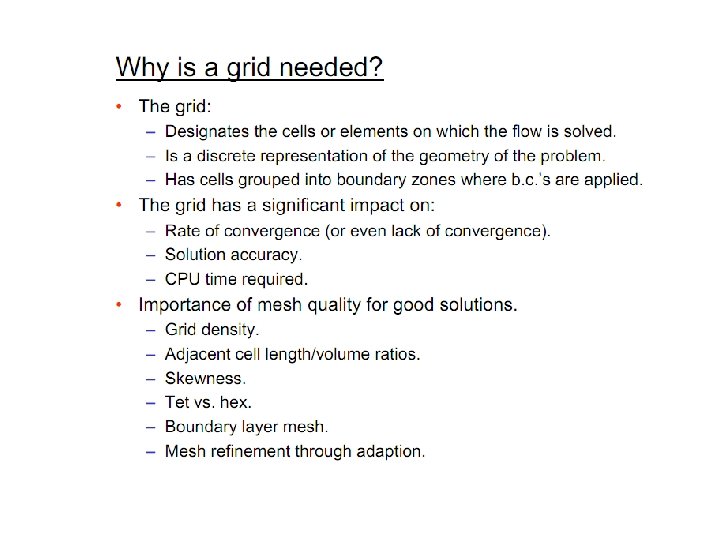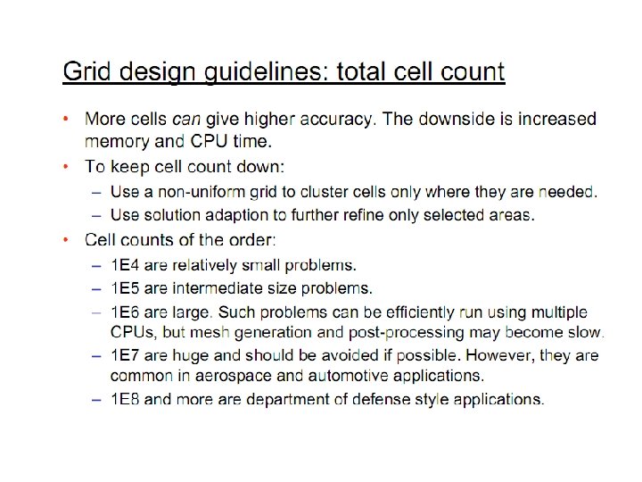 Grid generation l Grids can either be structured (hexahedral) or unstructured (tetrahedral). Depends upon type of discretization scheme and application – Scheme l Finite differences: structured l Finite volume or finite element: structured or unstructured – Application l Thin boundary layers best resolved with highly-stretched structured grids l Unstructured grids useful for complex geometries l Unstructured grids permit automatic adaptive refinement based on the pressure gradient, or regions of interest (FLUENT)