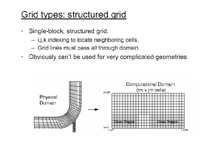 Grid generation and transformation Grids designed to resolve important flow features which are dependent upon flow parameters (e. g. , Re) Commercial codes such as Gridgen, Gambit For research code, grid generated by one of several methods (algebraic vs. PDE based, conformal mapping) For complex geometries, body-fitted coordinate system will have to be applied (next slide). Grid transformation from the physical domain to the computational domain will be necessary Sample grid established by Gambit of FLUENT