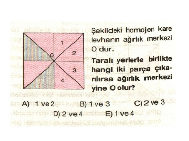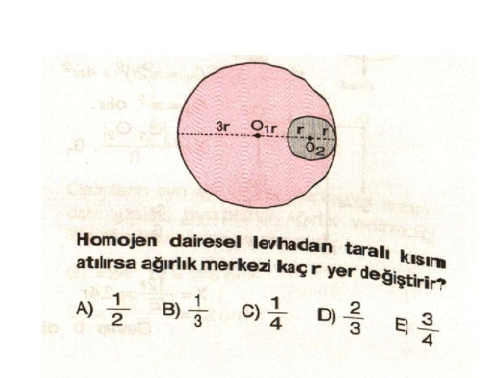 NOT: Cisimden parça çıkarılırsa cismin ağırlık merkezi çıkarılan parçanın zıt yönünde kayar. Çıkarılan parçanın ağırlığı zıt yönlü kuvvet gibi düşünülür.