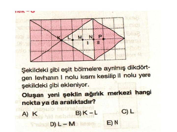 NOT: Tek düze olmayan cisimlerin ağırlık merkezi bulunurken, (cisim hangi noktadan asılırsa asılsın uzantısı ağırlık merkezinden geçer ) 1. Cisim K dan asılırsa ipin uzantısı KL doğrusudur. 2. M den asılırsa ipin uzantısından çizilen çizgi MN doğrusudur. KL ve MN P de kesiştiğinden P ağırlık merkezidir.