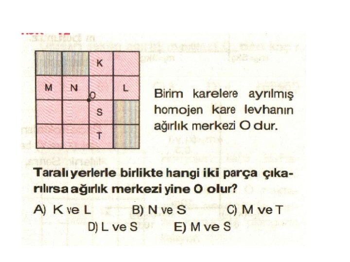 KÜTLE VE AĞIRLIK MERKEZİ: Cismin bütün parçalarının toplandığı, Cismi dengede tutan noktaya kütle ya da ağırlık merkezi denir. Momentler hesaplanırken cismin bütün ağırlığının ağırlık merkezinde toplandığı kabul edilir. TÜRDEŞ(TEK DÜZE) MADDE: Aynı cins maddeden meydana gelen maddeye denir.