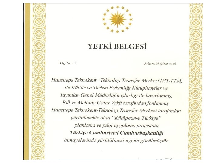 Kütüphan-e Türkiye Projesi • Bill ve Melinda Gates Vakfı’nın Küresel Gelişim Programı’nın bir parçası olan Küresel Kütüphaneler Girişimi aşağıda belirtilen fikirler doğrultusunda hareket etmektedir. • “Dijital dönemde fırsat eşitliği, özellikle zor koşullar altında yaşayanlar olmak üzere her bireyin interneti kullanma becerisiyle çevrimiçi bilgiye ulaşabilmesini gerektirmektedir. ” • “Var olan altyapıları, adanmış çalışanları ve bilgiyi kişilerle birleştirme misyonlarından dolayı kütüphaneler halka açık internet erişimini ve bunun eğitimini sunma konusunda eşsiz yerlerdir. ” Kaynak: www. gatesfoundation. org