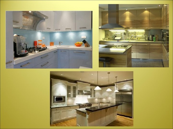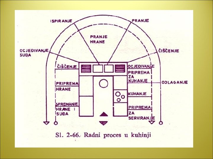 • u samoj kuhinji je jako važno osigurati dobre uvjete za radne procese, a to se postiže isključivo pravilnom dispozicijom kuhinjskih elemenata i uređaja • ograničenja su često postavljena nelogičnim rasporedom instalacija • da bi pravilno funkcionirala, potrebno je organizirati radni trokut, a to konkretno znači da položaj štednjaka, hladnjaka i praonika s ocjeđivačem trebaju biti u trokutastom prostornom odnosu • sheme organizacije kuhinja su I, II, L, U.