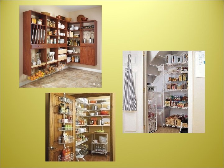 • u sklopu kuhinje se može nalaziti i odvojen prostor ostave, komu je najbolja orijentacija sjeverna, ali se često zbog pomanjkanja prostora koriste ventilirani ormari, koji su sastavni dio kuhinjskih elemenata