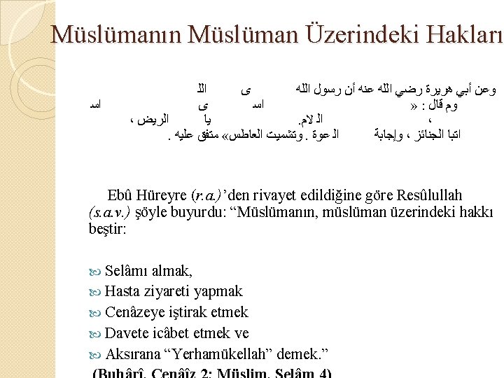 KAYNAKLAR � Ragıb el- İsfehani el- müfredat “hak”) � Süleyman Molla İbrahimoğlu “kul hakkı” Diyanet Aylık Dergi sayı 163) � İsra 17/23 � Nahl 16/90 � Nisa 4/36 � Buhârî, Edeb, 28; Müslim, Birr, 140, 141 � Tahrim 66/6 � İsra 17/26 � İbn Mace, Nikah 3 � Maide 5/32 � Bakara 2/188 � Bakara 2/262 -264 � (En’am 6/102 � Bakara 2/188; Nisa 4/29 -30; Maide 5/33 -38) � Hucurat 49/ 11 -12 � Hucurat 49/12 � Hadislerle İslam cilt 3, İbn Sa’d 2, 255) � Müslim Birr 59 � Müslim Birr/56 � Buhârî Mezalim 4, Tirmizî Fiten 68 � Sahife-i seccadiye dua kitabı 17/23)