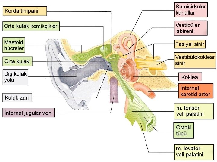 Kokleovestibüler sinir (n. cochleovestibularis = n. statoacusticus) Koklear sinir --- spiral (koklear) ganglion Vestibüler sinir --- vestibüler ganglion (Scarpa) Süperior vestibüler sinir • Urtikulus • SSSK • LSSK İnferior vestibüler sinir • Sakkulus • PSSK