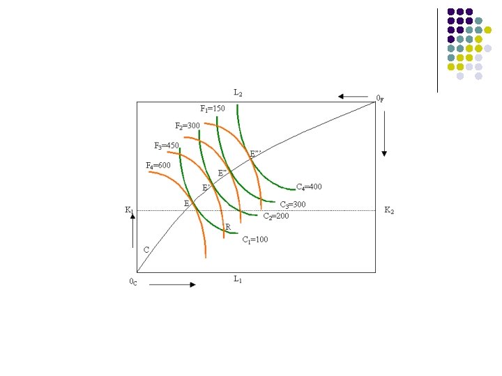 KECEKAPAN PENGELUARAN l l Bagaimana mengagihkan dua input (modal dan buruh) untuk mengeluarkan dua barangan (pakaian dan makanan)? EB - diagram menunjukkan semua kemungkinan kombinasi bagi 2 input antara 2 pengeluran barangan. Setiap titik dalam kotak Edgeworth menggambarkan peruntukan input K dan L antara barang F dan C. Titik pengagihan tidak cekap - pengagihan seterusnya dalam lingkungan kawasan yang masih boleh meningkatkan keluaran salah satu barangan atau keduaduanya.