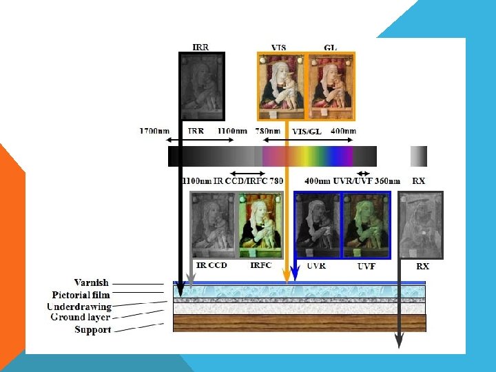 II- INFRA-RED RAYS –KIZIL ÖTESI IŞINLAR A. INFRA-RED CHARGE-COUPLED DEVICE (IRCCD)– KIZIL ÖTESI FOTOĞRAFLAMA B. INFRA-RED REFLECTROGRAPHY (IRCCDR) – KIZIL ÖTESI REFLEKTROGRAFISI C. INFRARED FALSE COLOR (IRFC) - KIZIL ÖTESI SAHTE RENKLE FOTOĞRAFLAMA Objeler kızıl ötesi ışınla analiz edildiğinde alt tabakalardaki detaylar görülebilir hale gelir. Kızıl ötesi ışın altında lead White gibi bazı pigmentler şeffaflaşır; bu da söz konusu detayların görünür olmasını sağlar. Bu analizle üstü kapanmış imzalar, ressamın eskiz çalışmaları, altta başka bir resmin varlığı, resme sonradan yapılan eklemeler ya da resimden üstü boyanarak silinmiş detaylar tespit edilir.