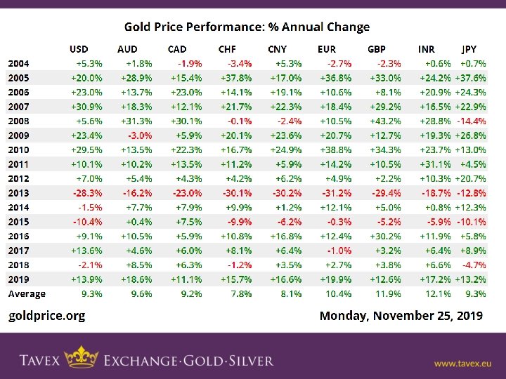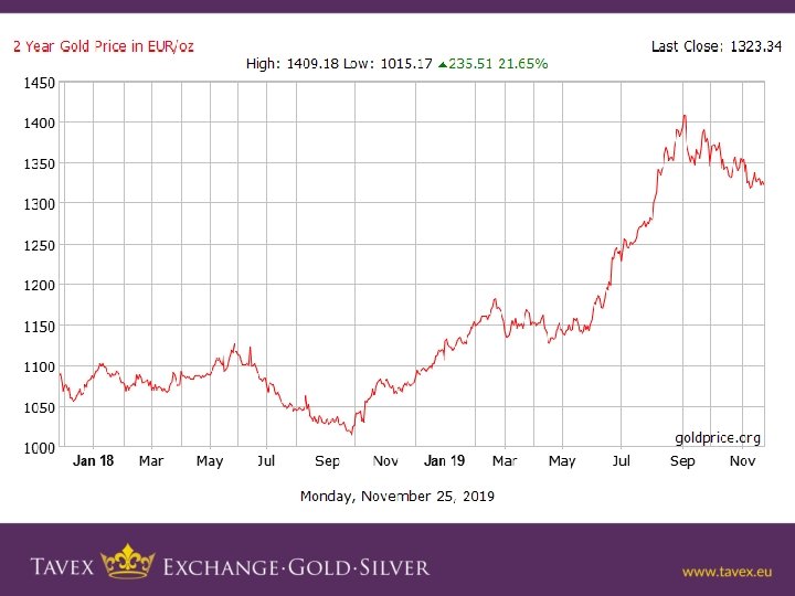• • • TAVEX GROUP Perustettu vuonna 1991 Suomessa vuodesta 1996 Myynyt fyysistä sijoituskultaa vuodesta 2005 • 2006: 835 kg • 2007: 1400 kg • 2008: 2150 kg • 2009: 1500 kg • 2010: 1750 kg • 2011: 2800 kg • 2012: 2300 kg • 2013: 3150 kg • 2014: 2900 kg • 2015: 2880 kg • 2016: 3200 kg • 2017: 3000 kg, osto 1500 kg • 2018: 3800 kg, osto 1600 kg • 2019: 3600 kg, osto 1500 kg Pohjoismaiden suurin sijoituskultayritys Konsernissa 35 toimipistettä ja se työllistää yli 250 henkilöä Tavex toimii kultapankin periaattella, myymme ja ostamme kultaa ja hopeaa