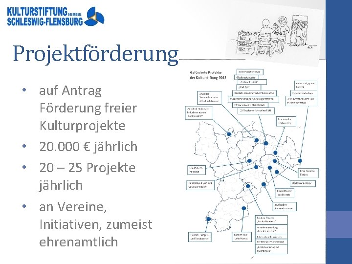 Projektförderung • auf Antrag Förderung freier Kulturprojekte • 20. 000 € jährlich • 20 – 25 Projekte jährlich • an Vereine, Initiativen, zumeist ehrenamtlich
