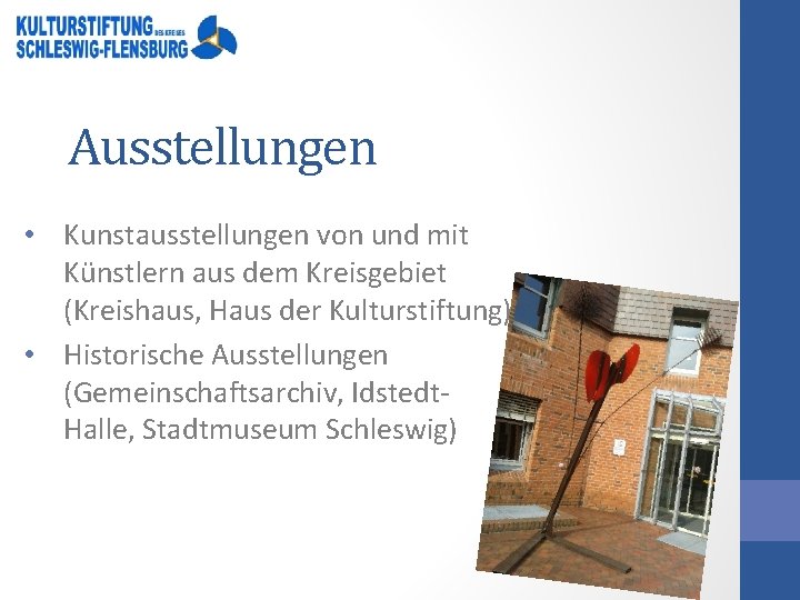 Ausstellungen • Kunstausstellungen von und mit Künstlern aus dem Kreisgebiet (Kreishaus, Haus der Kulturstiftung) • Historische Ausstellungen (Gemeinschaftsarchiv, Idstedt. Halle, Stadtmuseum Schleswig)