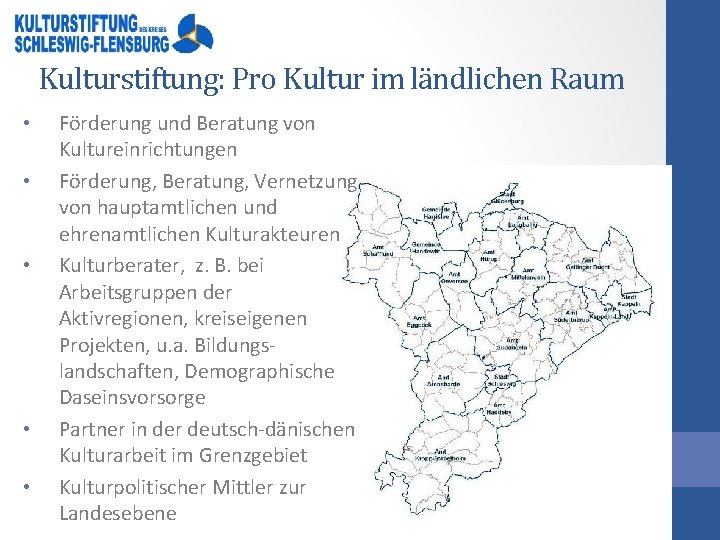 Kulturstiftung: Pro Kultur im ländlichen Raum • • • Förderung und Beratung von Kultureinrichtungen Förderung, Beratung, Vernetzung von hauptamtlichen und ehrenamtlichen Kulturakteuren Kulturberater, z. B. bei Arbeitsgruppen der Aktivregionen, kreiseigenen Projekten, u. a. Bildungslandschaften, Demographische Daseinsvorsorge Partner in der deutsch-dänischen Kulturarbeit im Grenzgebiet Kulturpolitischer Mittler zur Landesebene