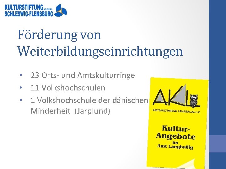 Förderung von Weiterbildungseinrichtungen • 23 Orts- und Amtskulturringe • 11 Volkshochschulen • 1 Volkshochschule der dänischen Minderheit (Jarplund)