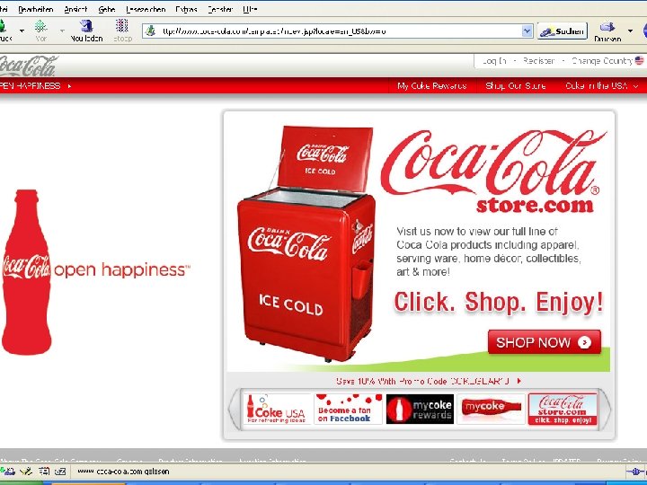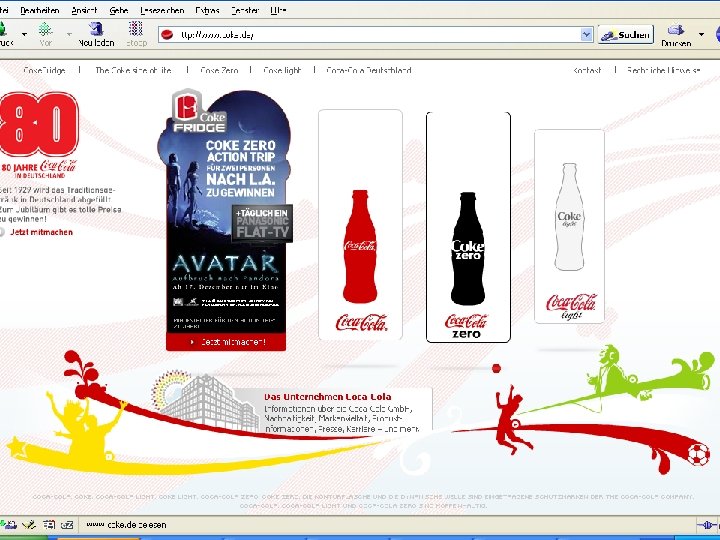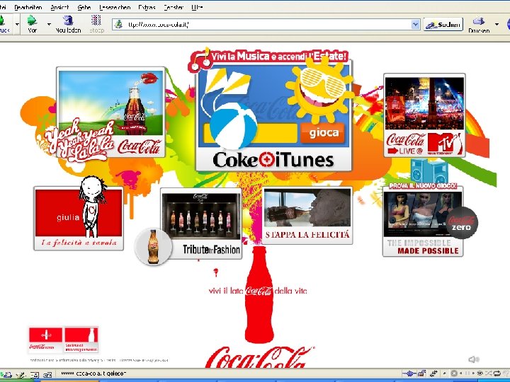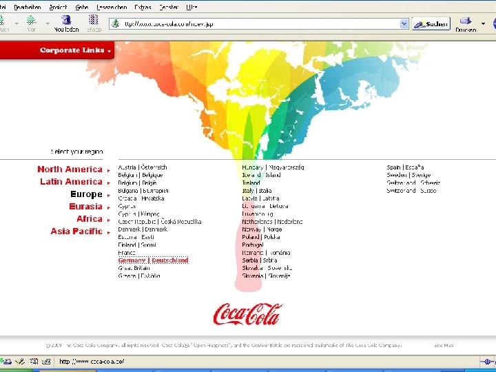 Beispiele: Coca-Cola Arbeitsschritte. W Sie sehen gleich 5 Beispiele internationaler Coca-Cola Webauftritte. Notieren Sie bitte die Unterschiede, die Ihnen auffallen. Würden alle Websites in allen Ländern gleich gut funktionieren? Spree WS 2009/2010 Seminar I-Prax: Inhaltserschließung visueller Medien, 5. 10. 2004